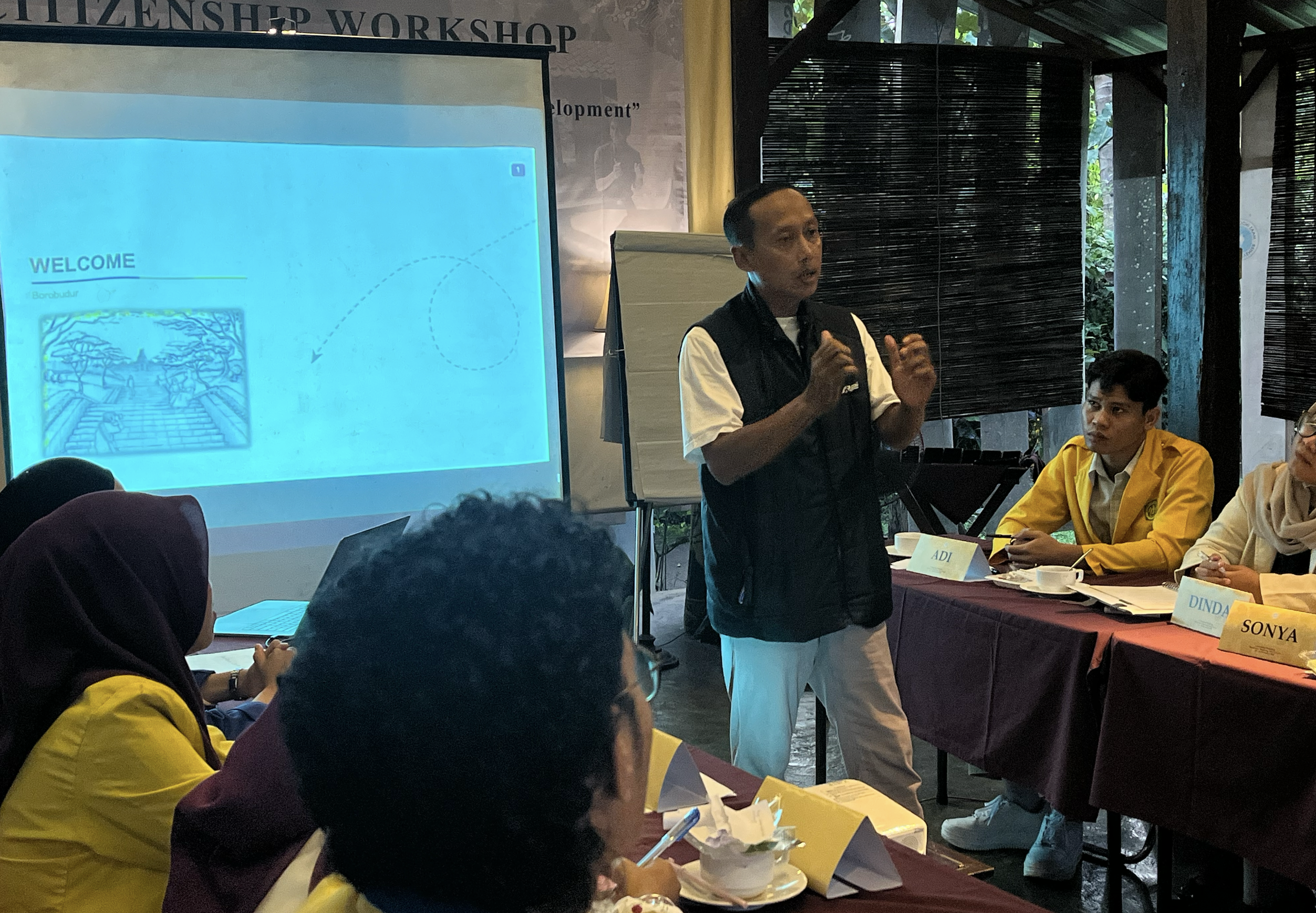 “Who is Indonesia” opened the first day’s session with Marsen Sinaga. Participants were asked to contribute ideas and discuss in groups issues such as the rich-poor gap, exploitation of the people, unfair policies, and solutions such as collective action. They were asked to understand Indonesia as a whole, both its positive and negative aspects, as a basis for proposing solutions, even on the smallest scale. This was followed by a session on “How to be a Professional Leader” by Henri Muhardiyanto. The material presented included: professional leadership competencies (integrity, empathy, decision-making), styles (democratic, transformational), and contrasting ‘nice’ vs. “good” leaders. The first day concluded with an introduction to local exposure by Mr. Mura (cultural observer) on the history of Magelang, Borobudur, and local wisdom.