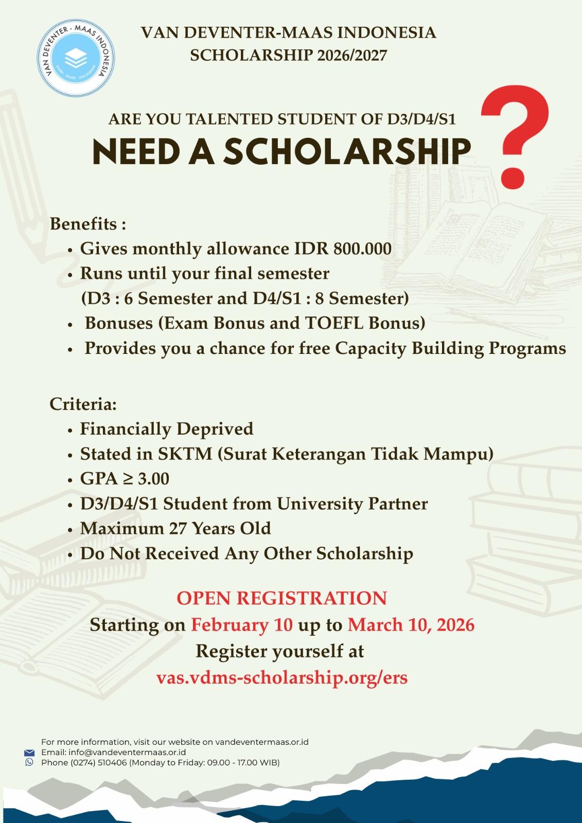 Van Deventer-Maas Indonesia opens the oppoertunity to gain the VDMI scholarship for D3, D4 and S1 students. The Online Registration System (ORS) starts from February 10 to March 10, 2026. All students are welcome, include students with disabilities. The requirement files include SKTM, KTP, KTM, Parents Income, Electricity Bills, Kartu Keluarga, Essays and Bank Account.